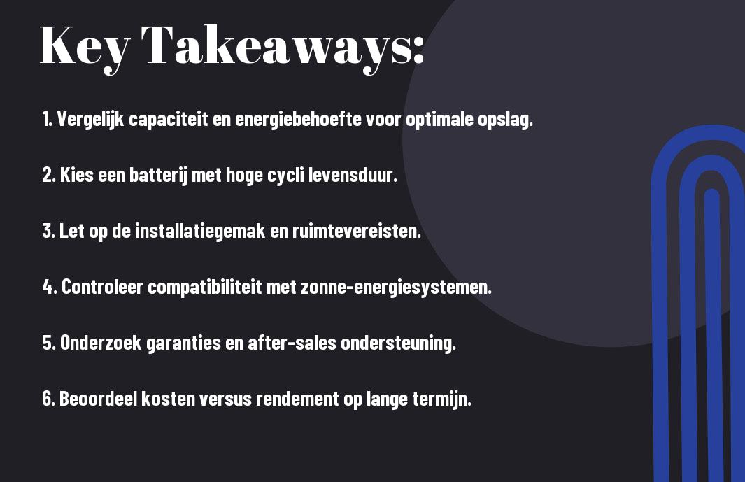 Ik heb de voordelen van een thuisbatterij onder de aandacht gebracht, zoals kostenbesparing op energiekosten en de mogelijkheid om jouw energieverbruik te optimaliseren. Daarnaast is het belangrijk om je te realiseren dat niet alle batterijen gelijk zijn; de keuze voor het juiste type opslag kan een groot verschil maken in de efficiëntie en levensduur van jouw systeem.
