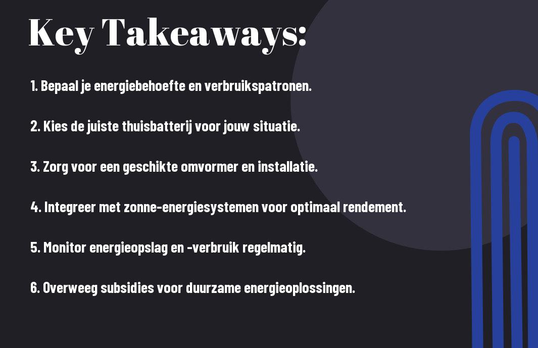 Het integreren van een thuisbatterij vereist weloverwogen keuzes en een goed begrip van jouw eigen energiebehoeften. Je moet rekening houden met factoren zoals de capaciteit van de batterij, het energieverbruik van jouw huishouden, en de mogelijkheden voor hernieuwbare energie. Onthoud dat het ook belangrijk is om de veiligheid in acht te nemen; het verkeerd installeren van een batterij kan leiden tot gevaarlijke situaties. Zorg ervoor dat je de aanbevolen richtlijnen gevolgd en, indien nodig, een professional inschakelt.